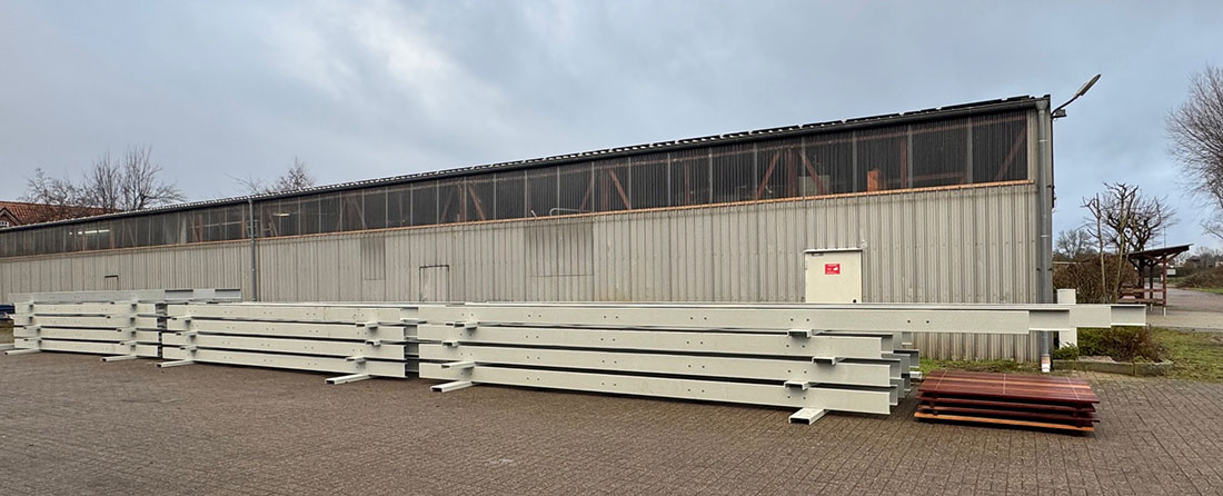 Anfang 2025 hat Alex Cordes eine Konstruktionszeichnung angefertigt, auf dessen Basis die Firma dann die vorgeschriebene Statik für den Tragfähigkeitsnachweis erstellt hat. Im Juli 2025 wurde zunächst das Material für die Anfertigung eines Testsegmets aus Holland abgeholt. Dieses erwies sich als tauglich und im November lieferte die Firma die restlichen 68, 12 m langen U- und Winkelprofile, die dann in der Bauhalle zugesägt wurden. Am Ende gab es etliche Einzelteile: Genauer: 337 GFK-Teile, 478 GFK-Winkelprofile und dazu dann noch ca. 3.500 Schrauben Muttern und Scheiben. Der Bodenbelag musste aus Kostengründen erst mal wiederverwendet werden. Die Einzelsegmente werden zwischen Halle 3 und 4 gelagert, die Vorfertigung und der Zusammenbau erfolgt dann in der Bauhalle.