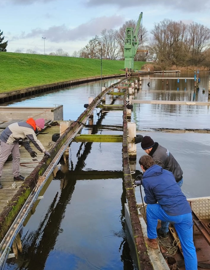 Bei passender Witterung begann dann ab 2026 der Neubau im Hafen. Das Gewicht der Unterkonstruktion pro Segment beträgt ca. 200 kg, inkl. Beläge ca. 400 kg. Für die Endmontage im Hafen kommen das flache Arbeitsboot und zwei Scherenhubtische zum Einsatz. Damit werden die Segmente eingehoben und dann mit den vorher montierten GFK-Zangen (an den weißen Dalben befestigte Querträger) verschraubt. Die Arbeiten sollen bis zum ersten Slippen am 28.03.2026 abgeschlossen sein. Für Planung, Konstruktion, Design, Funktionalität und Umsetzung zeichnen maßgeblich Alex Cordes und Marc Flegel – eine starke Leistung!