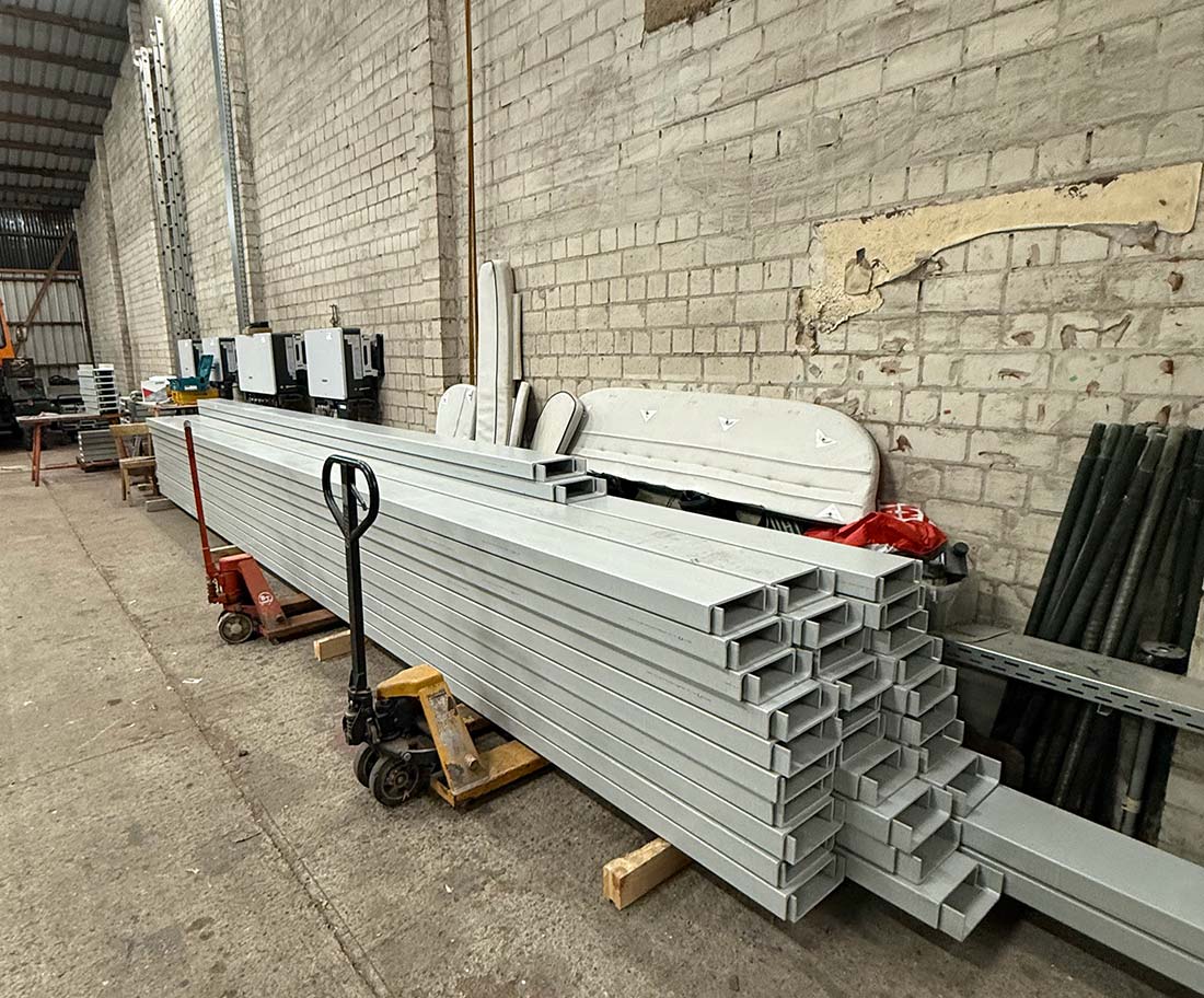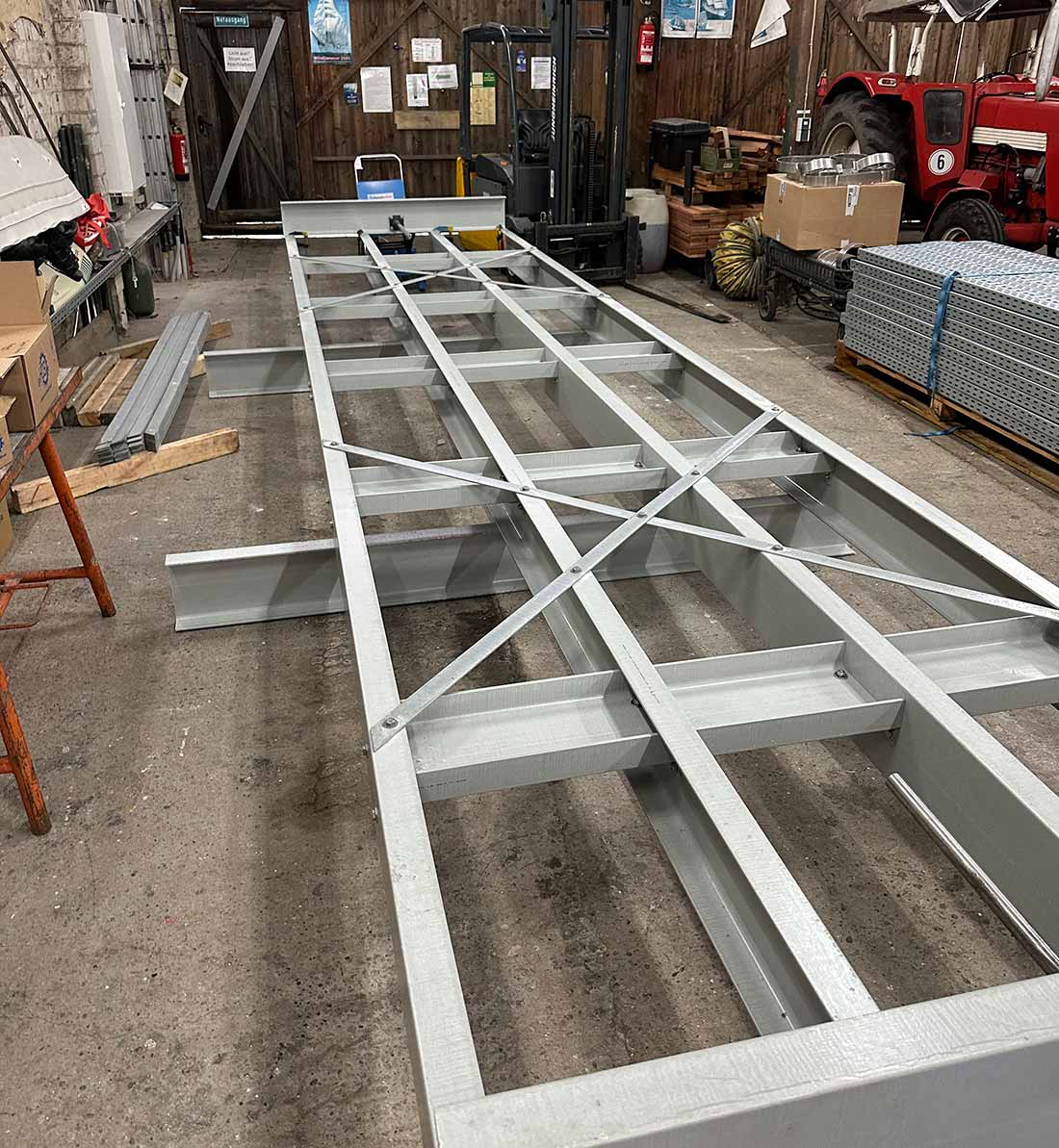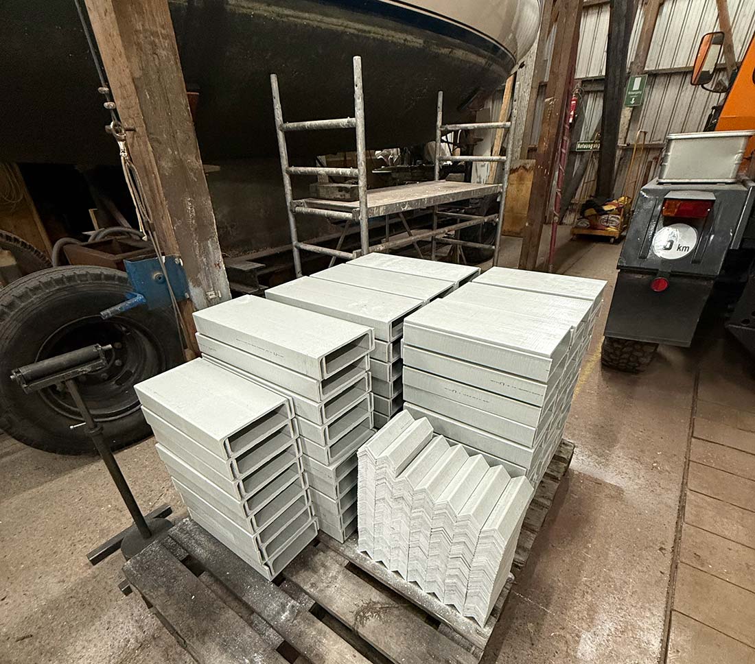 Anfang 2025 hat Alex Cordes eine Konstruktionszeichnung angefertigt, auf dessen Basis die Firma dann die vorgeschriebene Statik für den Tragfähigkeitsnachweis erstellt hat. Im Juli 2025 wurde zunächst das Material für die Anfertigung eines Testsegmets aus Holland abgeholt. Dieses erwies sich als tauglich und im November lieferte die Firma die restlichen 68, 12 m langen U- und Winkelprofile, die dann in der Bauhalle zugesägt wurden. Am Ende gab es etliche Einzelteile: Genauer: 337 GFK-Teile, 478 GFK-Winkelprofile und dazu dann noch ca. 3.500 Schrauben Muttern und Scheiben. Der Bodenbelag musste aus Kostengründen erst mal wiederverwendet werden. Die Einzelsegmente werden zwischen Halle 3 und 4 gelagert, die Vorfertigung und der Zusammenbau erfolgt dann in der Bauhalle.