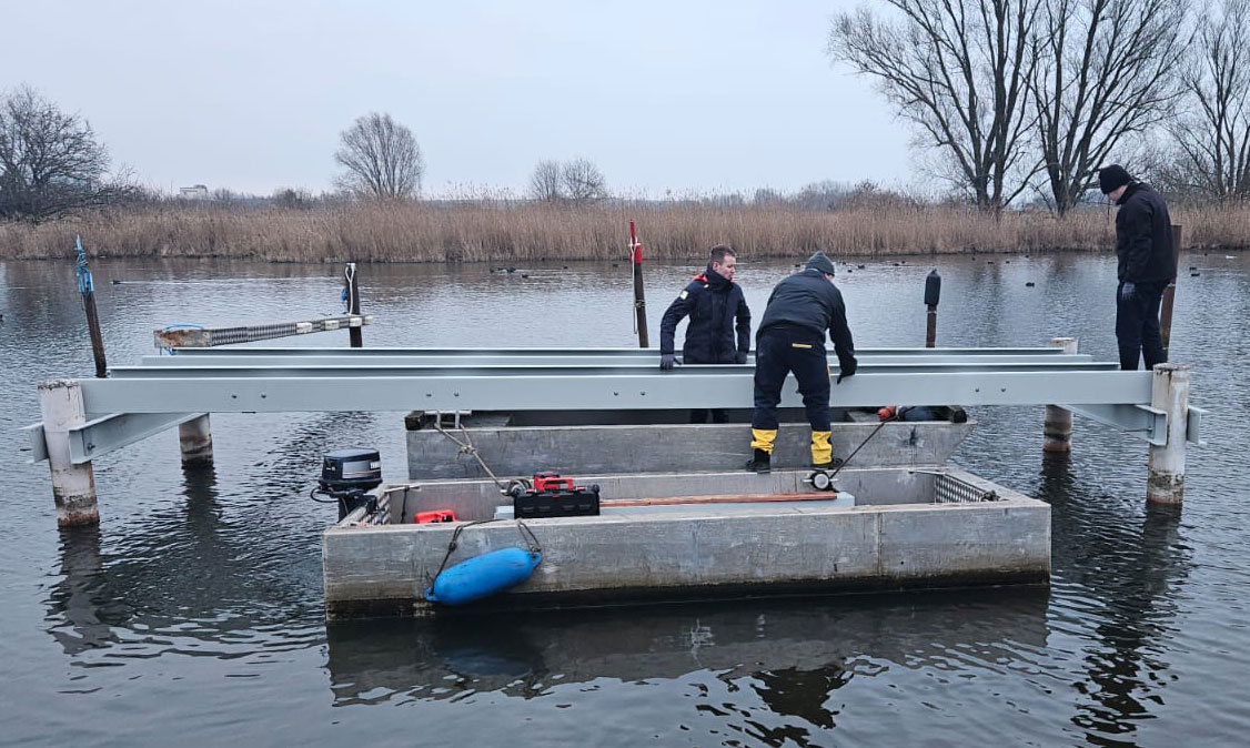 Bei passender Witterung begann dann ab 2026 der Neubau im Hafen. Das Gewicht der Unterkonstruktion pro Segment beträgt ca. 200 kg, inkl. Beläge ca. 400 kg. Für die Endmontage im Hafen kommen das flache Arbeitsboot und zwei Scherenhubtische zum Einsatz. Damit werden die Segmente eingehoben und dann mit den vorher montierten GFK-Zangen (an den weißen Dalben befestigte Querträger) verschraubt. Die Arbeiten sollen bis zum ersten Slippen am 28.03.2026 abgeschlossen sein. Für Planung, Konstruktion, Design, Funktionalität und Umsetzung zeichnen maßgeblich Alex Cordes und Marc Flegel – eine starke Leistung!
